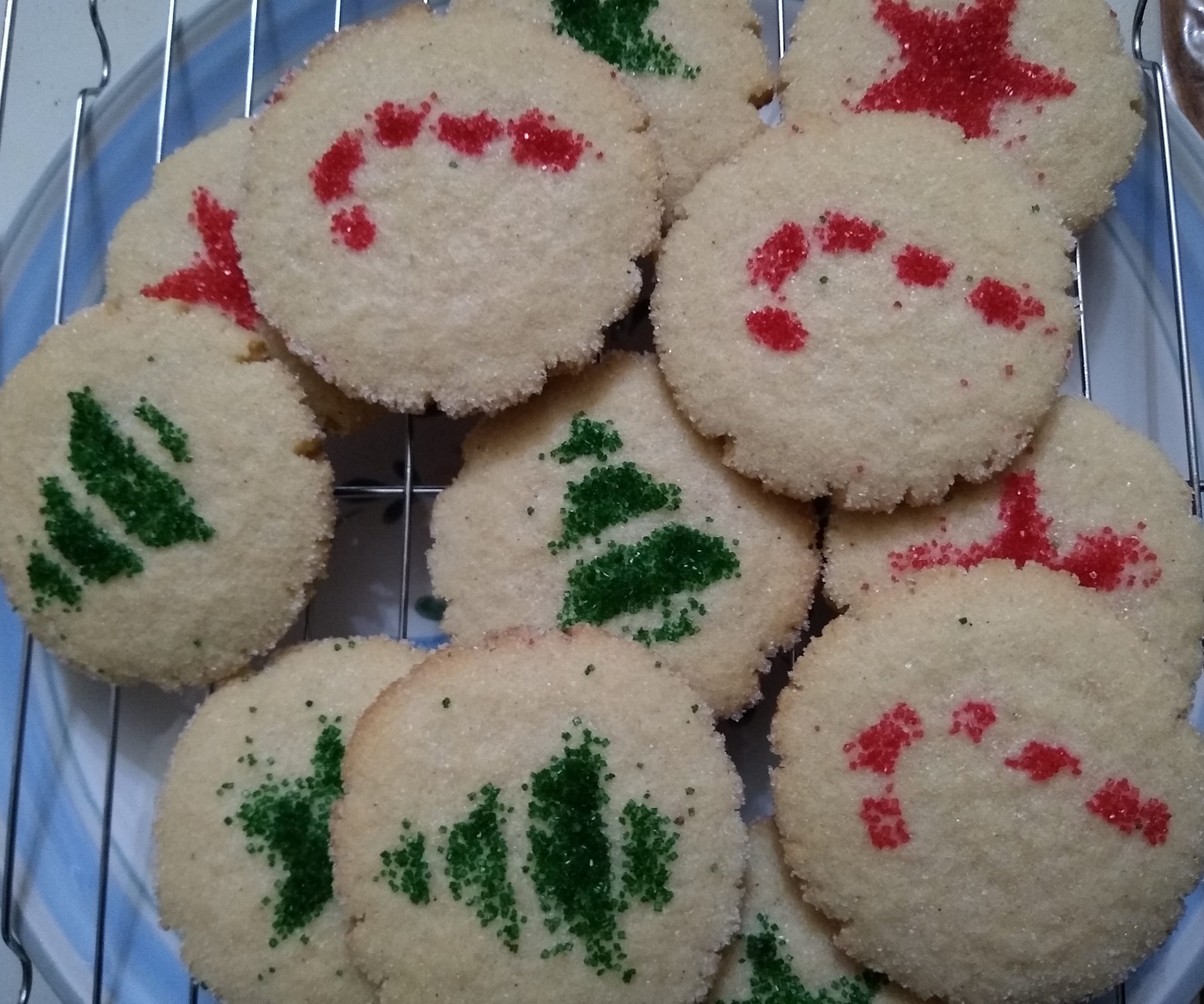 To turn these into Christmas cookies, I use stencils made from index cards, with cut outs of various holiday shapes, such as gifts, pine trees, candy canes, Christmas balls, etc., and I lay them over the cookies after flattening them, and sprinkle red & green colored sugar on them, before baking the cookies.
