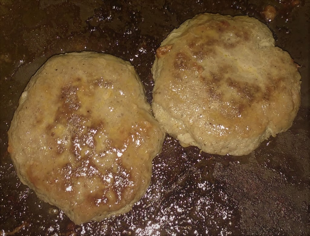 - In a 10″ non-stick frying pan, cook 3-4 at a time, slowly, over low flame, till well browned and cooked all the way through.
